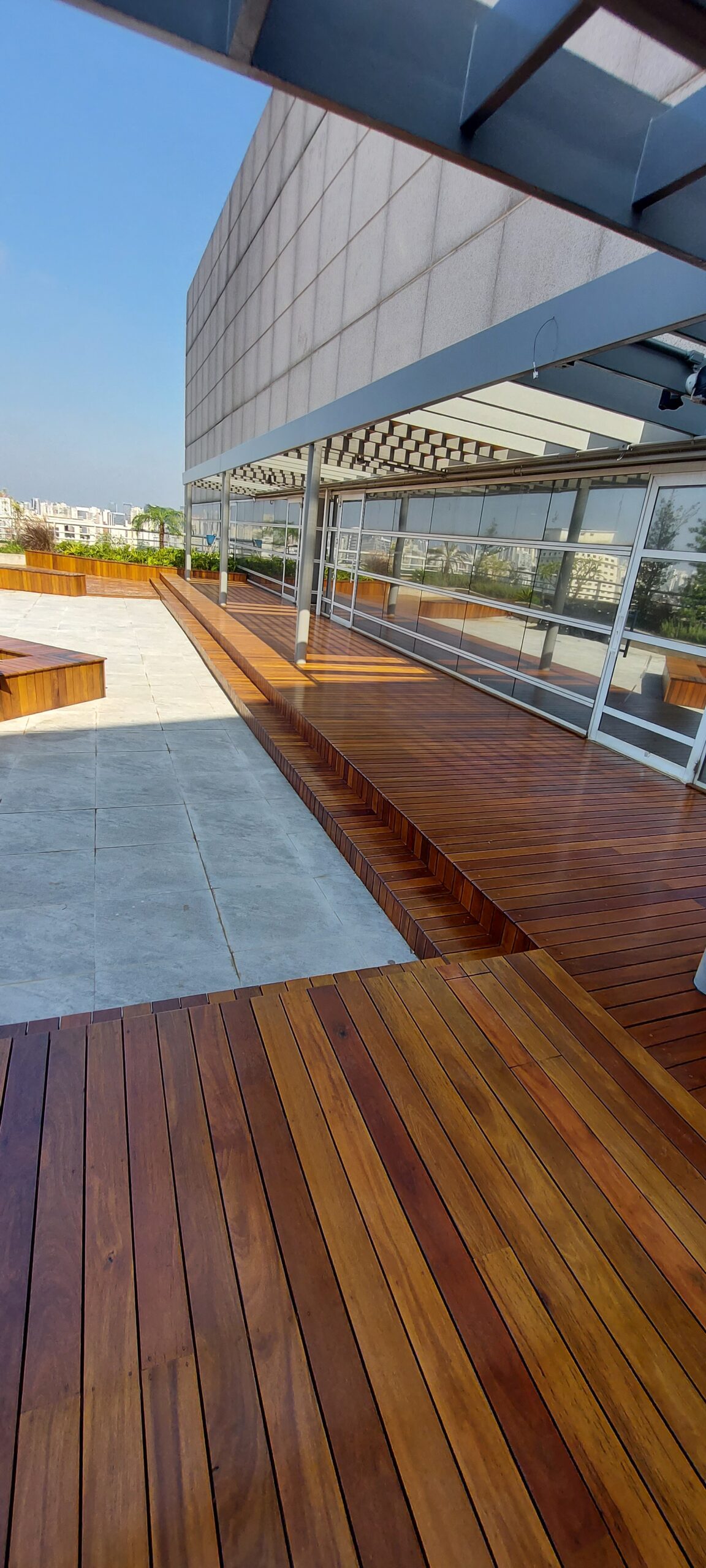 O Deck pode ser instalado de forma modular ou contínua, adaptando-se a formatos complexos e permitindo a integração com jardins e paisagismo.