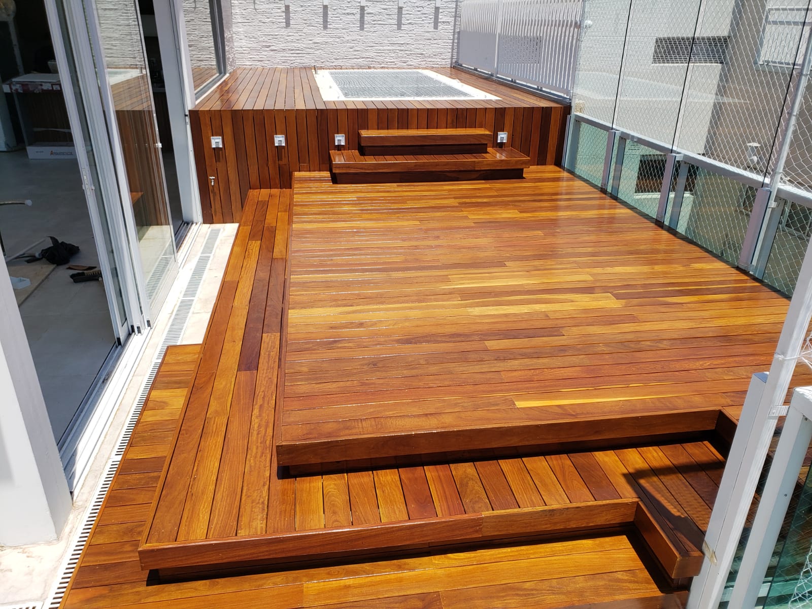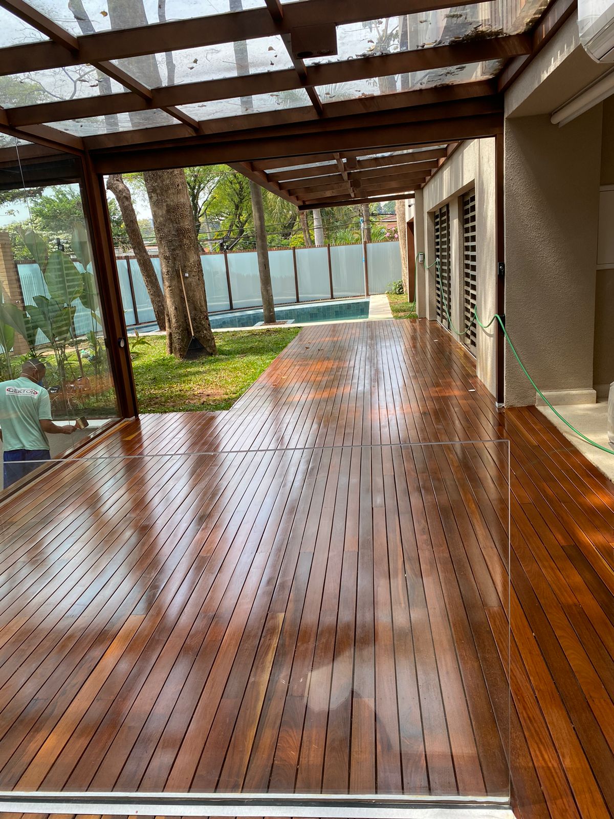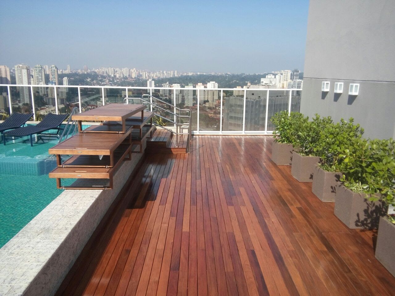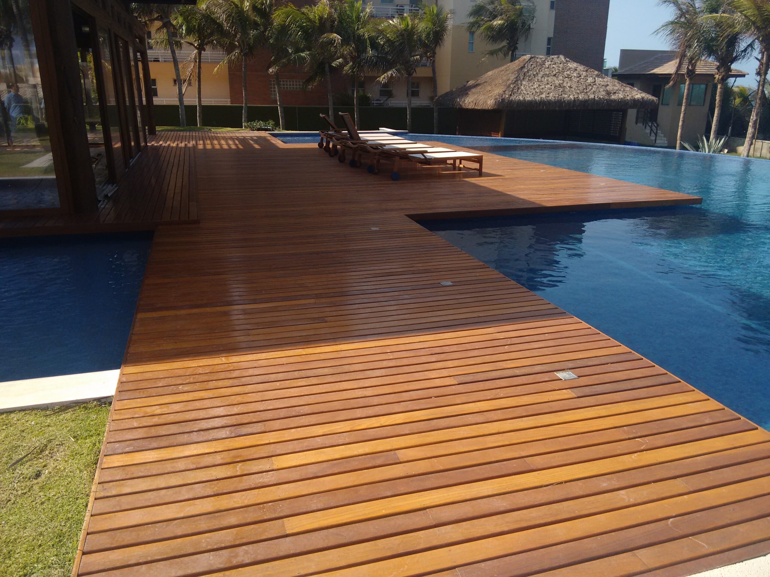 As réguas de deck possuem acabamento ou ranhuras (frisos) que proporcionam maior segurança ao caminhar, mesmo molhadas, sendo ideal para áreas de piscina.